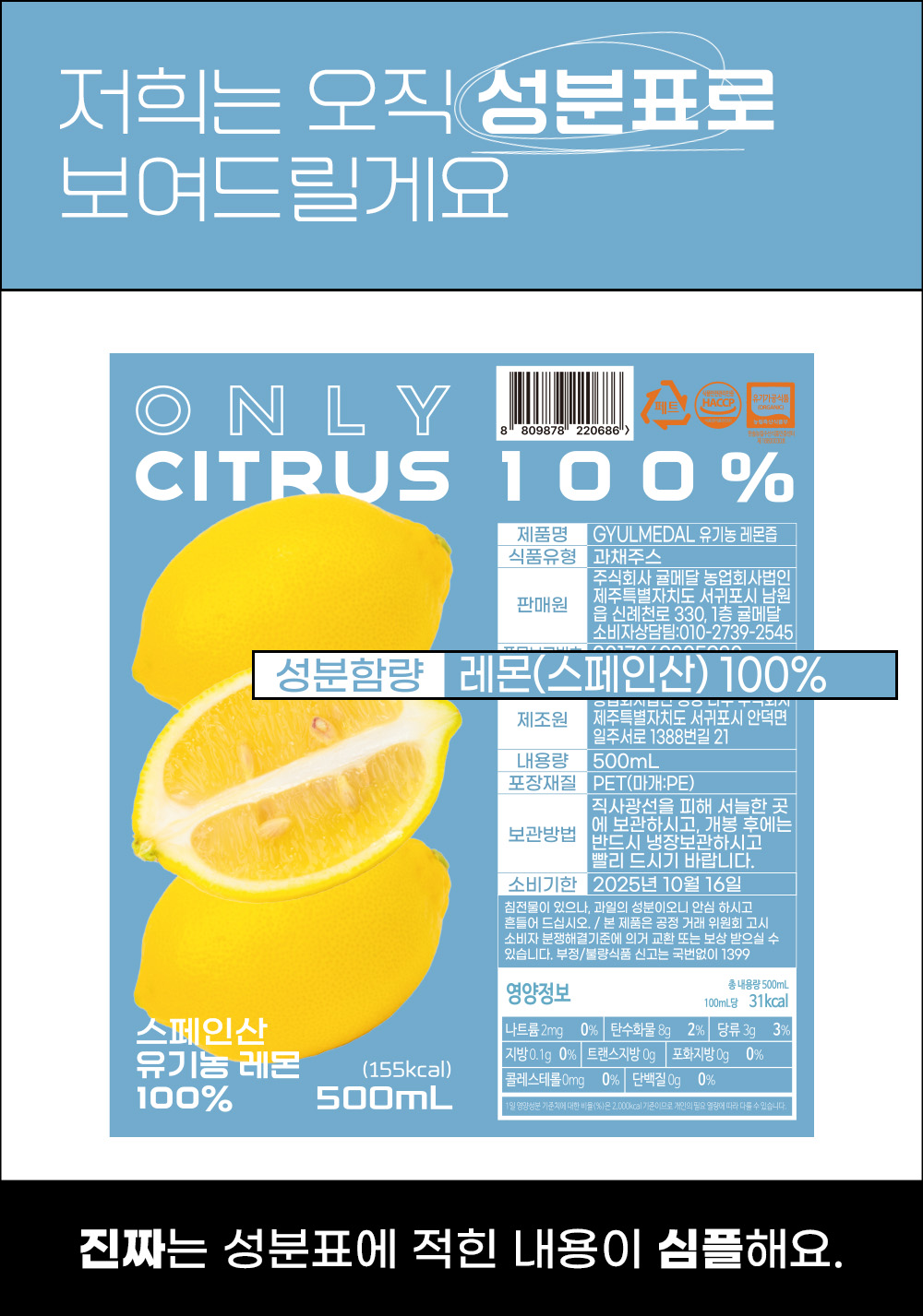Company : 주식회사 귤메달 농업회사법인 | Owner : 양제현 | 사업자등록번호 : 556-88-02227 | Address : 63208 제주특별자치도 제주시 중앙로 217 (벤처마루) 7층 705호, 귤메달 | Privacy Manager 양제현 (citrus@gyulmedal.com) | 통신판매업 : 2021-제주남원-00136
